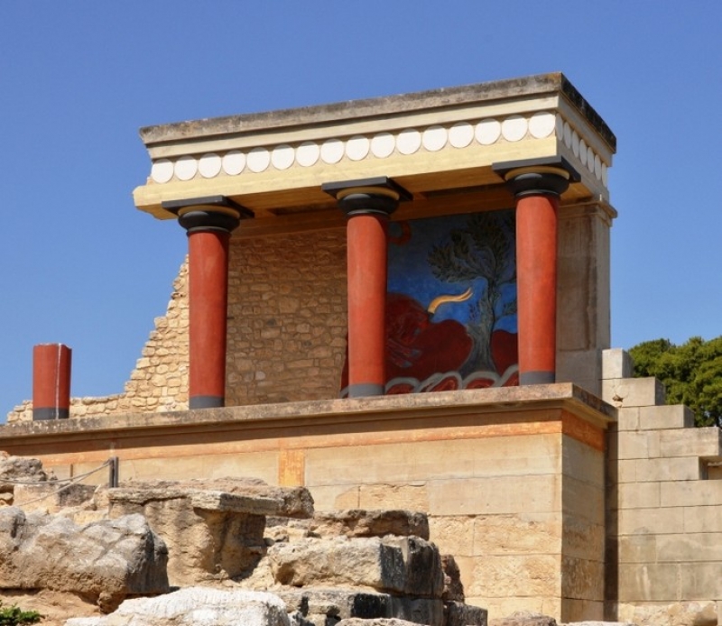 Το Παλάτι της Κνωσού, που είναι και το μεγαλύτερο από τα σωζόμενα Μινωικά ανακτορικά κέντρα. Τέσσερα φτερά-άξονες είναι διατεταγμένα γύρω από μια κεντρική αυλή και που φέρουν τα βασιλικά διαμερίσματα, τα εργαστήρια, τα ιερά, τις αποθήκες, την αίθουσα του θρόνου και τις αίθουσες των δεξιώσεων.